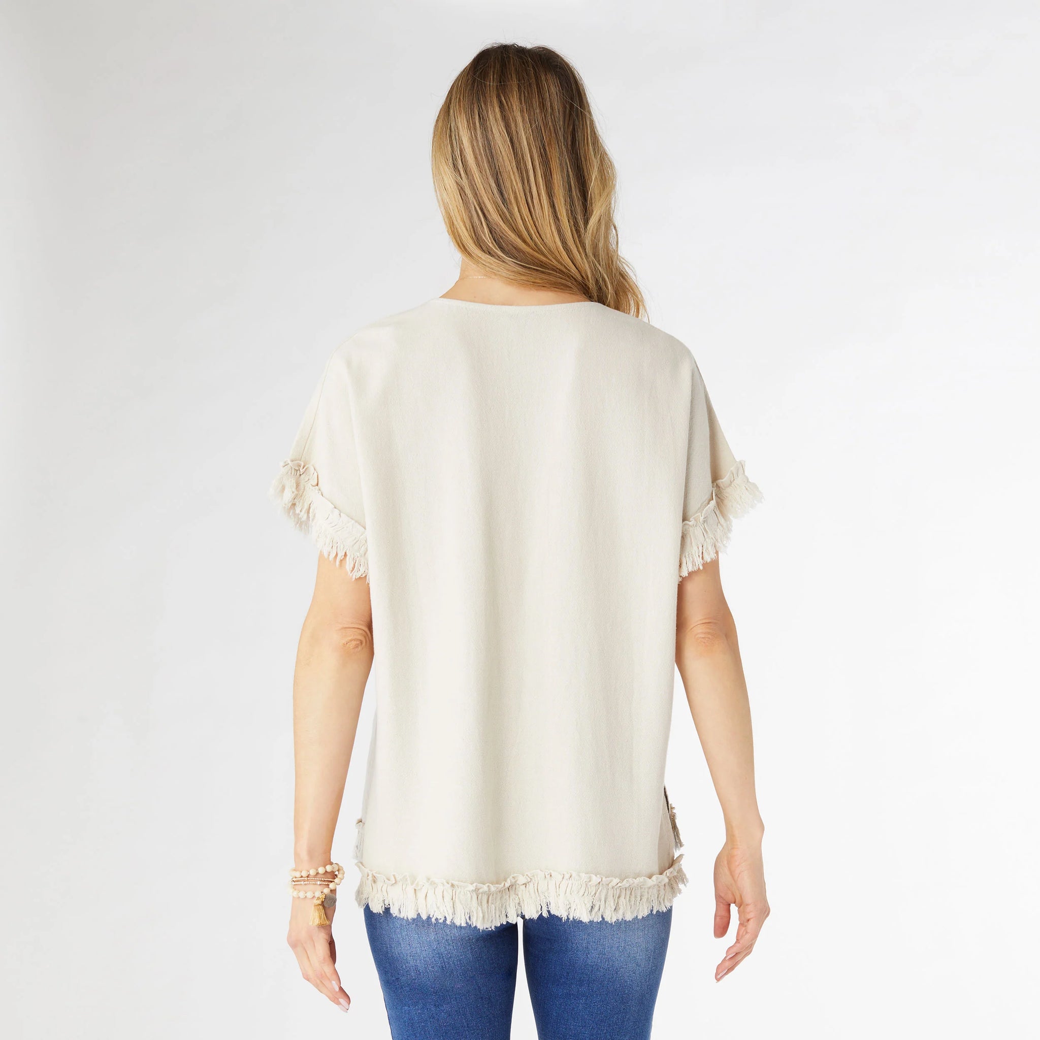 Stay cool and chic in our River Flowy Short Sleeve Top! With its trendy fringe design and comfortable v-neck, this top is a must-have for your warm weather wardrobe. Pair it with the matching pants or your favorite shorts for an effortless look. Materials: Viscose/Linen.