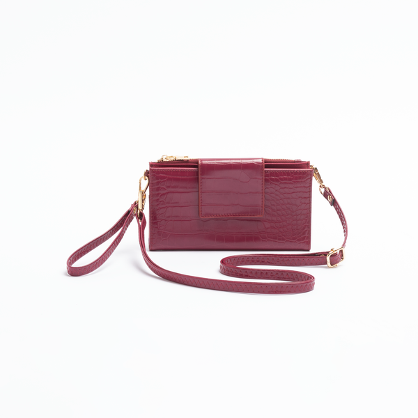 Soft faux croc material with shiny metal hardware.  Fold over top with snap closure.  Removable/adjustable crossbody strap and removable wristlet strap.  Inside front has bill slip pocket while inside back has zip pocket with gusset.  Six (6) credit card slots.  7.5"L x 5"W x 4.25"H   Simply Noelle
