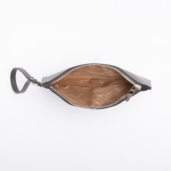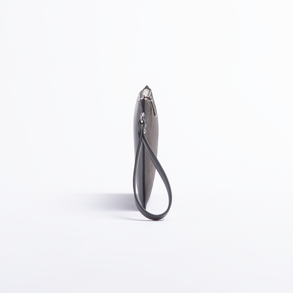 Color blocked felt-like material with coordinating trim.  Shiny accent hardware.  Top zipper closure.  Wristlet strap.  One main compartment.  9.75"L x 6.5"H.